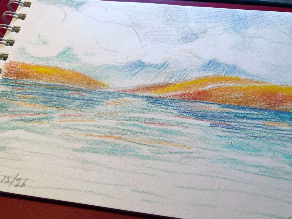 A small sketch from my bedside stash of art materials. Whenever I pick up a pencil or brush with no preconceived idea of what to draw, it often turns out to be a sea/sky-scape. I love using complementary colour combinations for the dynamics they set up on the canvas.