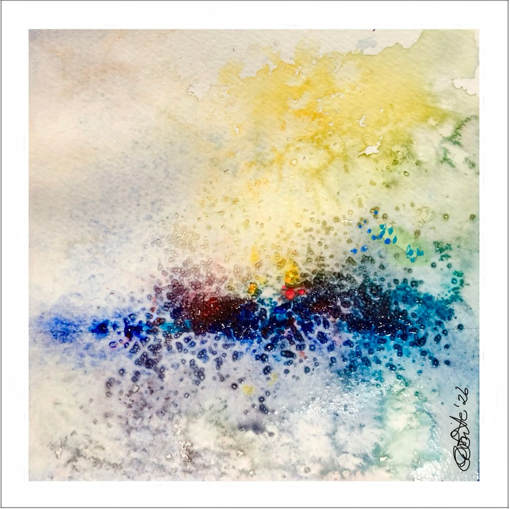 In this approximately 6” x 6” watercolour, I dabbed some beads of Daniel Smith tube colours (Yellow Light, New Gamboge, Pyrrol Scarlet, Quinacridone Rose, French Ultramarine, Phthalo Blue) midway down the sheet. Next, I floated clear water up to the paint, tipping the board to flow the colour into the corners of the space. When still wet, I sprinkled some table salt in a couple spots. Some lovely cloud-type and crystalline shapes formed. Though the salt did not disperse as much in later stages. Perhaps the paint was too dry by that time. Also, the salt didn’t rub off very well after dry. I expect it will work better with thinner washes.