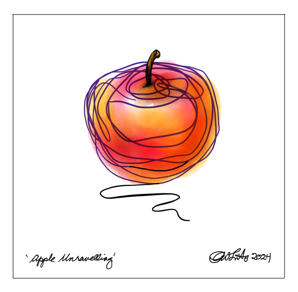 Drawn in 2024 it was the first of dozens of apple drawings and paintings, using a variety of analogue materials and digital drawing applications.